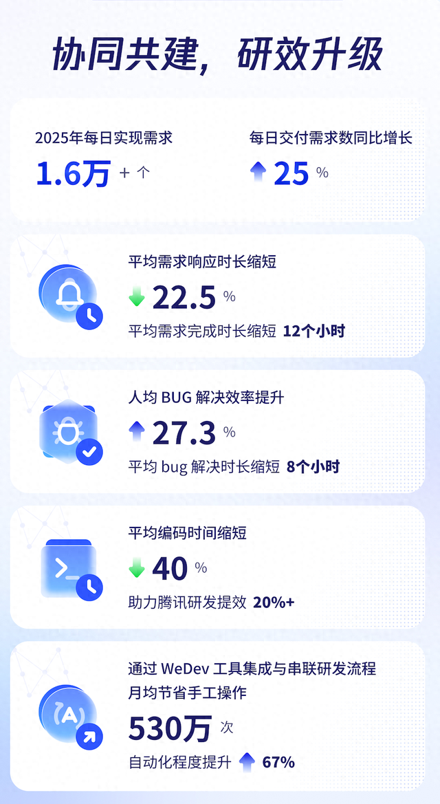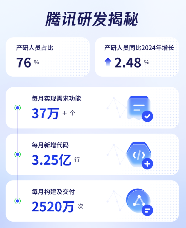 2025年,腾讯产研人员占比达76%,每 4 个腾讯员工中就有 3 个从事研发工作。腾讯月均新增代码3.25亿行,每月完成需求37万个,构建交付2520万次,支撑业务快速迭代。