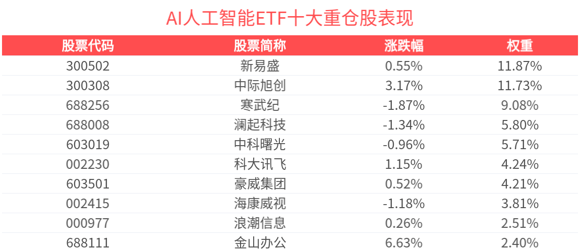 数据显示,截至2025年9月30日,中证人工智能主题指数(930713)前十大权重股分别为新易盛(300502)、中际旭创(300308)、寒武纪(688256)、澜起科技(688008)、中科曙光(603019)、科大讯飞(002230)、豪威集团(603501)、海康威视(002415)、浪潮信息(000977)、金山办公(688111),前十大权重股合计占比61.36%。