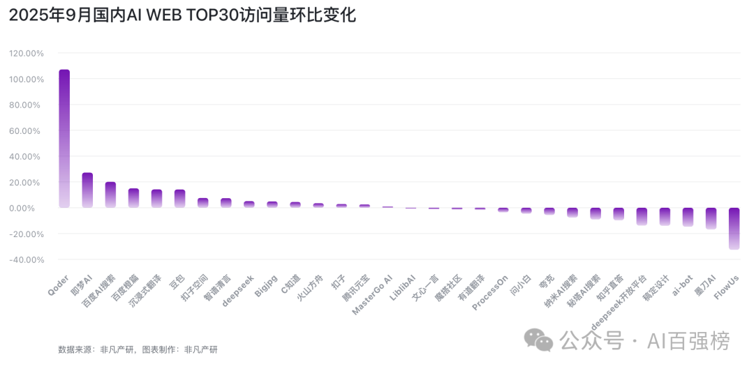 增速亮点:Qoder(开发工具,+107%)、讯飞智作(视频生成,+90%)、即梦 AI(图片生成,+27%)、百度 AI 搜索(+20%)等,显示“创作链路 + 检索入口”在 Web 端仍有可持续的拉新能力。
