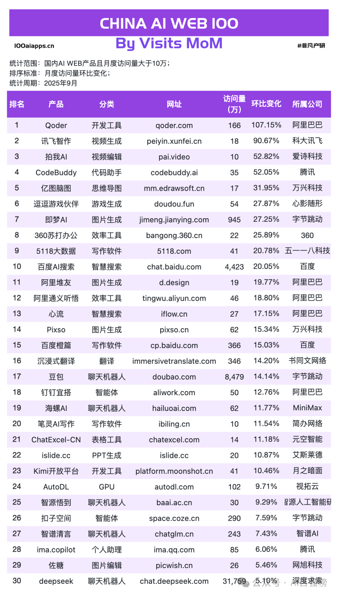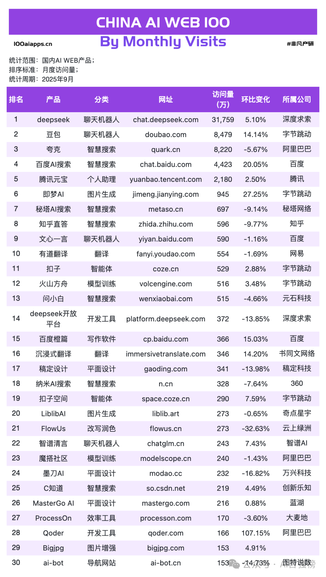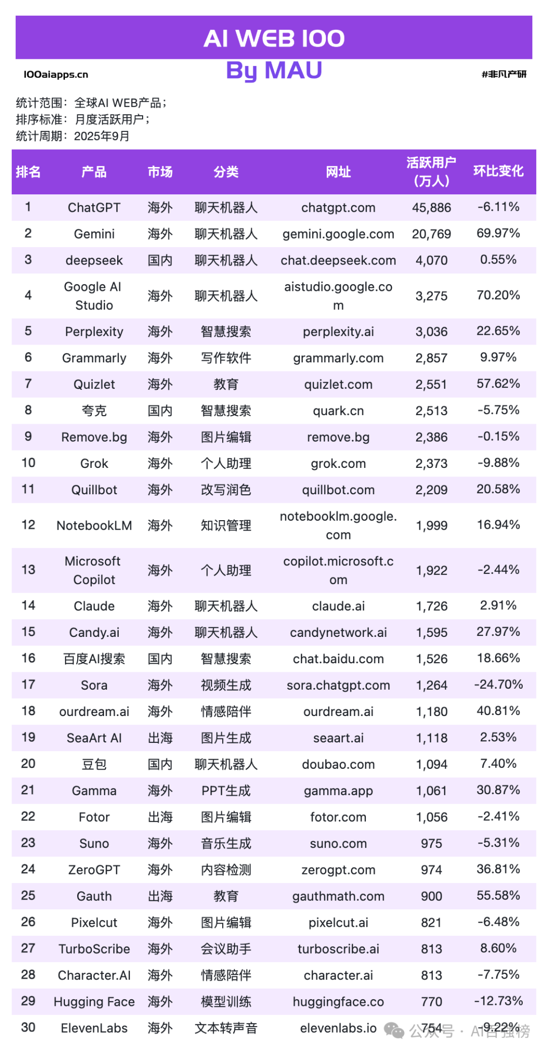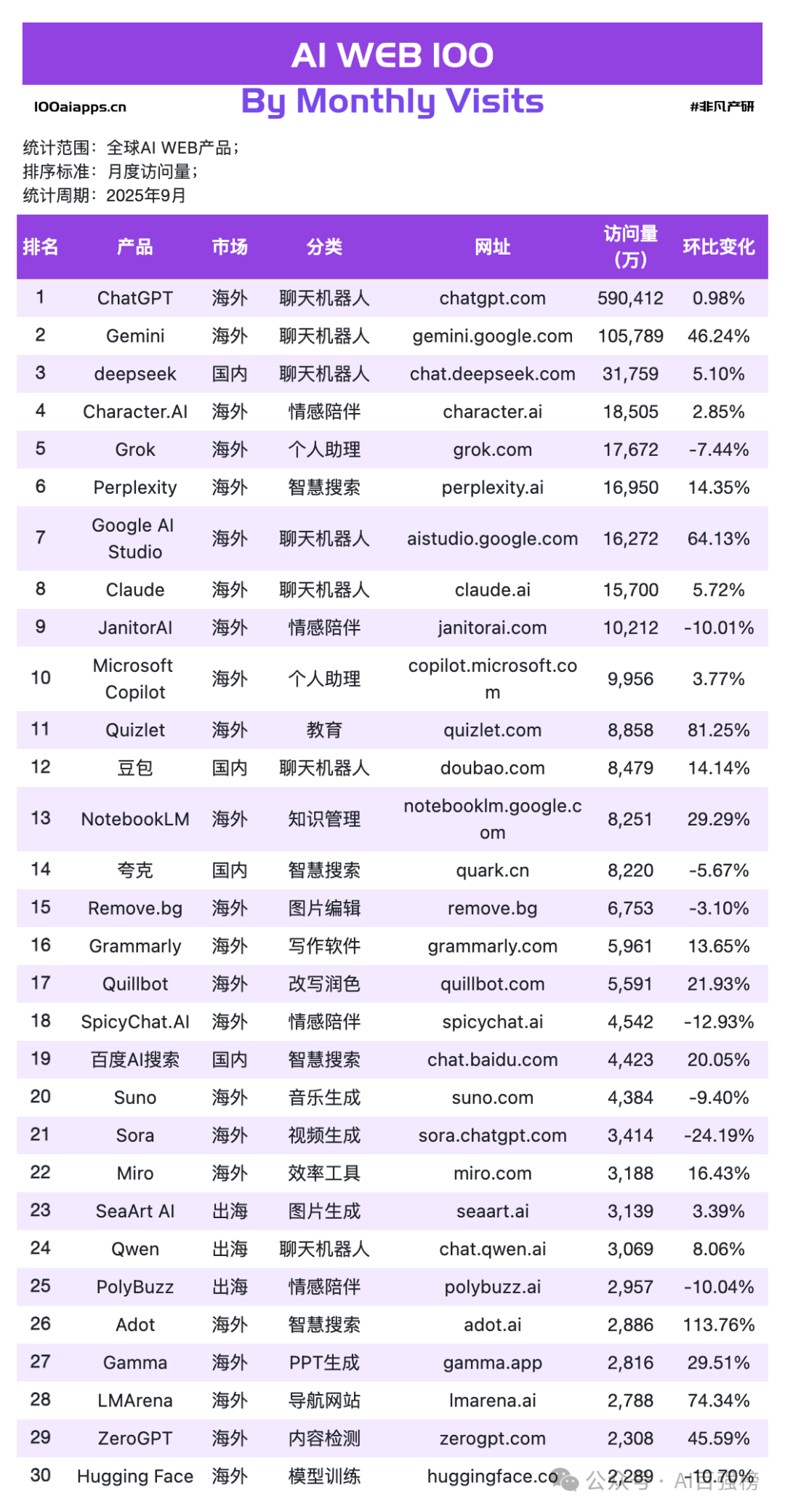非凡产研发布的2025年9月AI Web榜单明细如下: