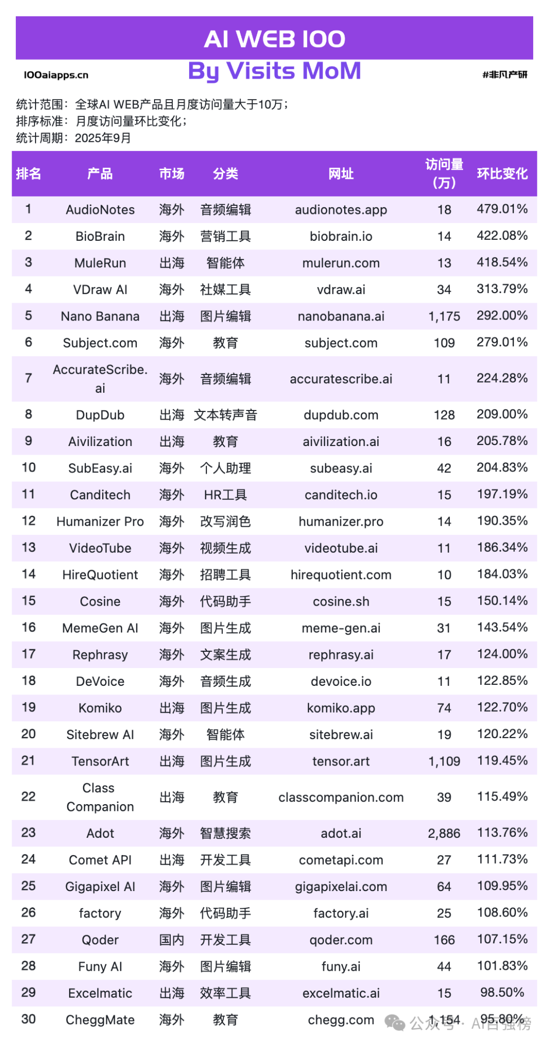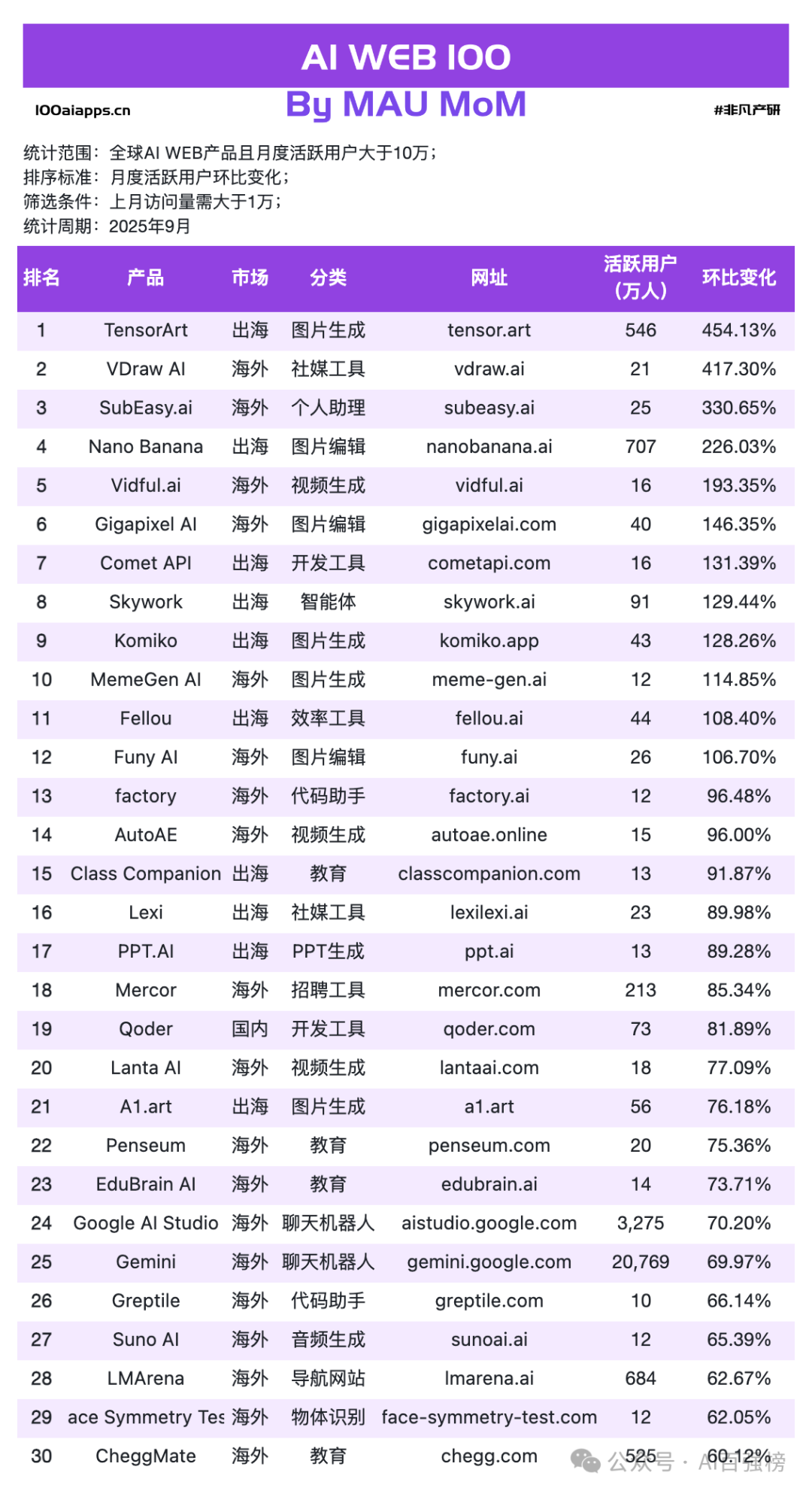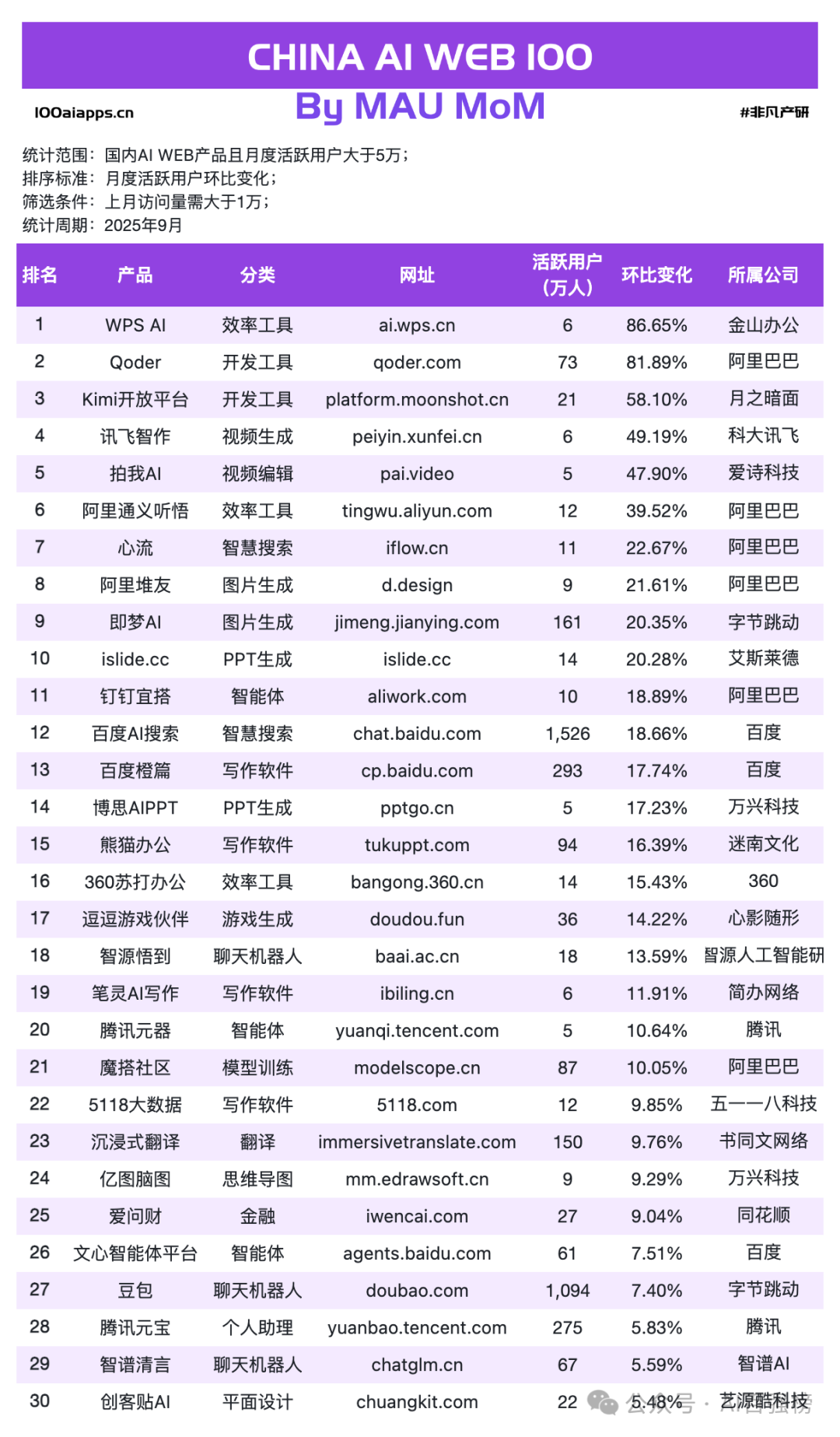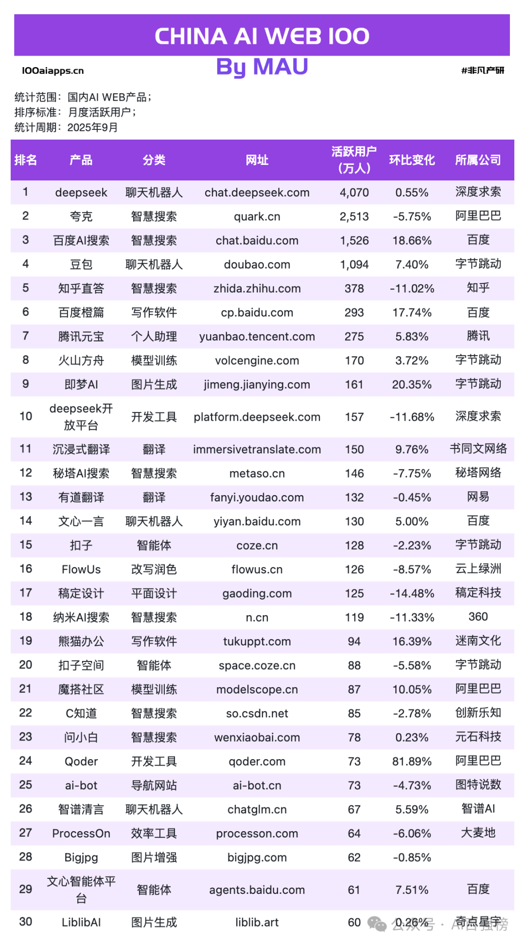 非凡产研发布的2025年9月AI Web榜单明细如下: