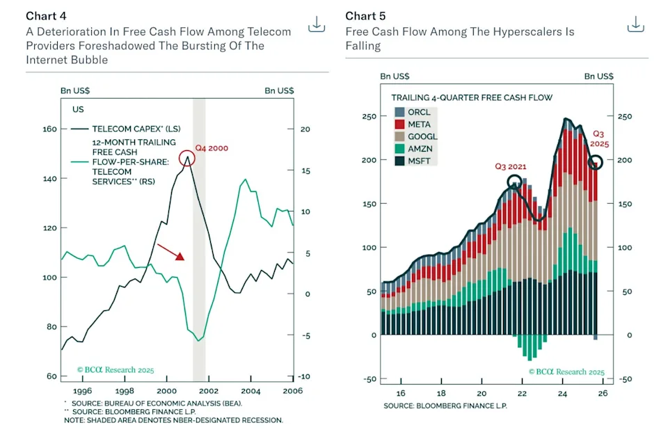 首先,近几个月来,所谓的超大规模企业(hyperscalers)——在人工智能上投入巨资的大型科技公司——的自由现金流有所下降,这可能表明这些公司的资产负债表更弱。Berezin说,这与互联网泡沫破裂前电信股的情况类似。