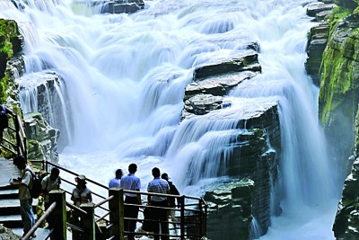 游客在湖北利川市腾龙洞景区游览“卧龙吞江”自然奇观。新华社发