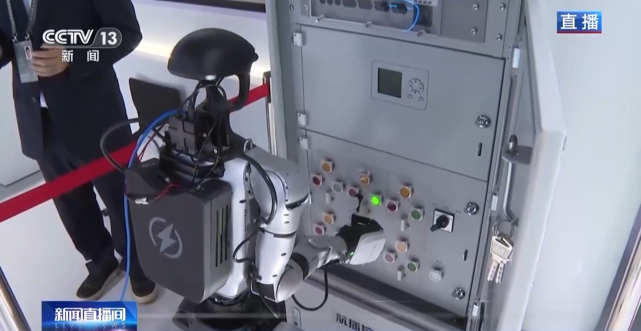 例如这台由当地电力部门经过精准改造后的同款格斗人形机器人,正在代替人工尝试进行电力检修,它能够通过AR调度平台远程控制,去旋扭、翻盖和按压。当赛场上的人形机器人穿上“工装”,可以在生产和实践中大展拳脚。