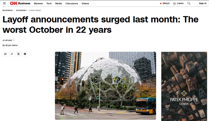 CNN对此发文称,美国10月份裁员公告激增175%,创2003年来最高单月纪录,主要受人工智能影响,大公司如亚马逊和Target宣布大规模裁员。经济繁荣后市场回归正常,但也面临人工智能采用、消费与企业支出放缓、成本上升压力。