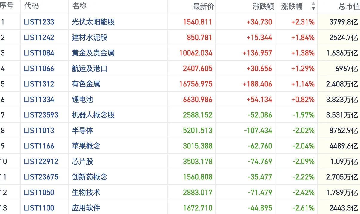 其他方向上,半导体芯片、消费电子、生物医药、汽车等热门板块走低。教育、机械、券商、地产股也集体下行。