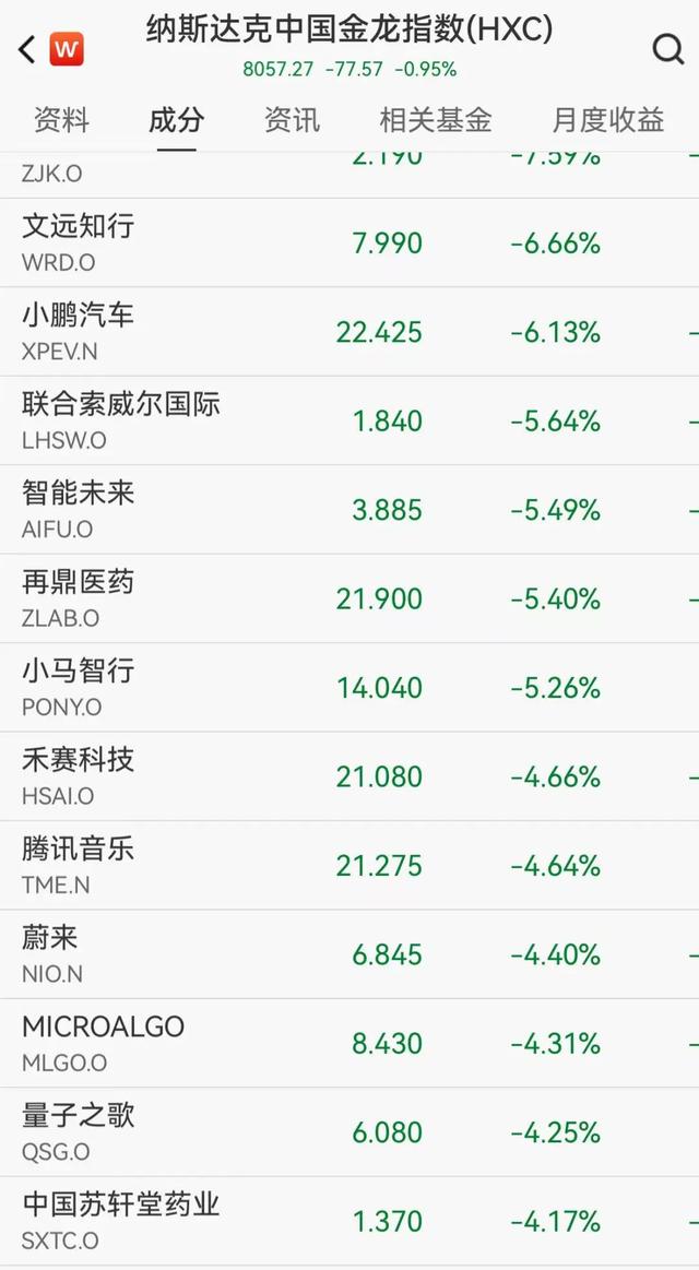 热门中概股多数下跌,纳斯达克中国金龙指数跌0.95%,本周累跌2.62%。小鹏汽车跌超6%,小马智行、再鼎医药跌逾5%,腾讯音乐、蔚来跌超4%,好未来、哔哩哔哩等跌超2%,新东方、贝壳等跌超1%,百度、阿里巴巴等小幅下跌;唯品会涨超2%,携程网、富途控股小幅上涨。