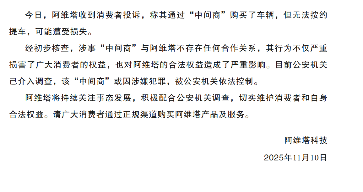阿维塔科技11月10日发布声明:今日,阿维塔收到消费者投诉 【下载黑猫投诉客户端】,称其通过“中间商”购买了车辆,但无法按约提车,可能遭受损失。经初步核查,涉事“中间商”与阿维塔不存在任何合作关系,其行为不仅严重损害了广大消费者的权益,也对阿维塔的合法权益造成了严重影响。目前公安机关已介入调查,该“中间商”或因涉嫌犯罪,被公安机关依法控制。阿维塔将持续关注事态发展,积极配合公安机关调查,切实维护消费者和自身合法权益。请广大消费者通过正规渠道购买阿维塔产品及服务。