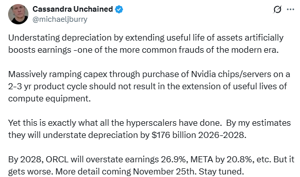 伯里当地时间周一在社交平台X上发文称,那些所谓的“超大规模算力服务商”,正在通过延长芯片折旧年限、压低折旧费用,人为放大AI热潮带来的账面利润。