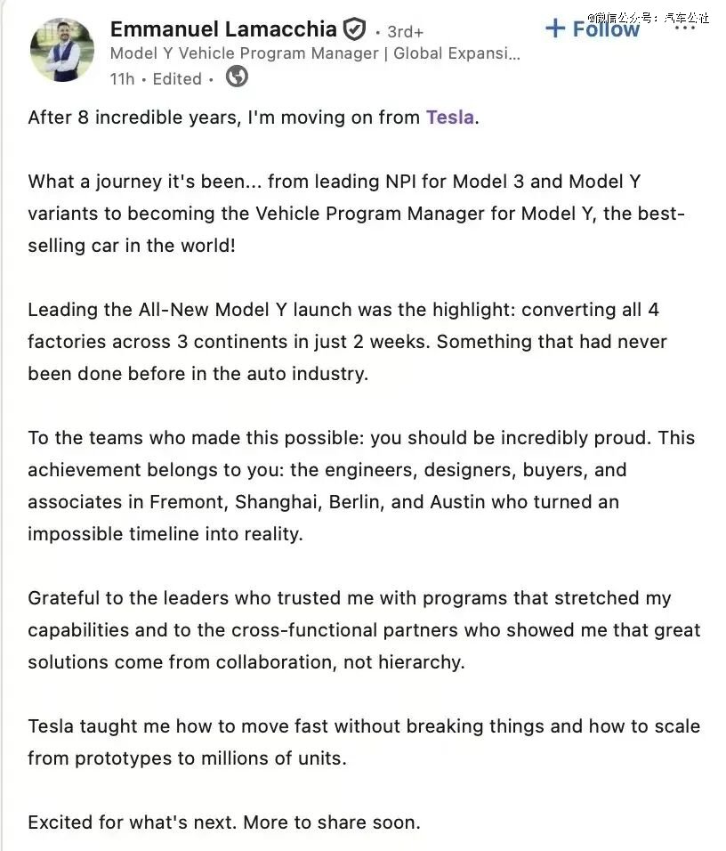 在阿瓦斯蒂宣布离开公司的几小时后,畅销车型Model Y的项目经理伊曼纽尔·拉马奇亚Emmanuel Lamacchia也对外正式宣布离开特斯拉。