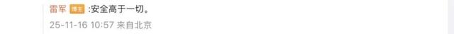 11月16日,小米汽车雷军连发多条微博,重申小米汽车的安全设计理念;有网友断章取义,说小米汽车好看比安全重要,雷军回应称:安全是基础,安全是前提,安全高于一切。