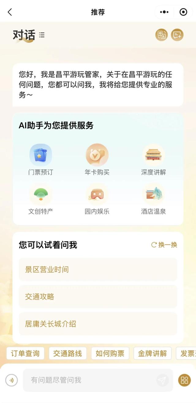 “以前来昌平玩要查好几份攻略,现在打开一个小程序就能搞定所有事。”首批体验的游客表示,从门票预约到美食推荐再到AI导览,全流程的智能服务大幅提升了出游效率。昌平文旅集团相关负责人介绍,此次小程序升级是昌平推动“文化+科技”融合赋能文旅产业的重要举措,未来还将持续优化功能,让更多游客感受昌平的历史底蕴与智慧服务魅力。