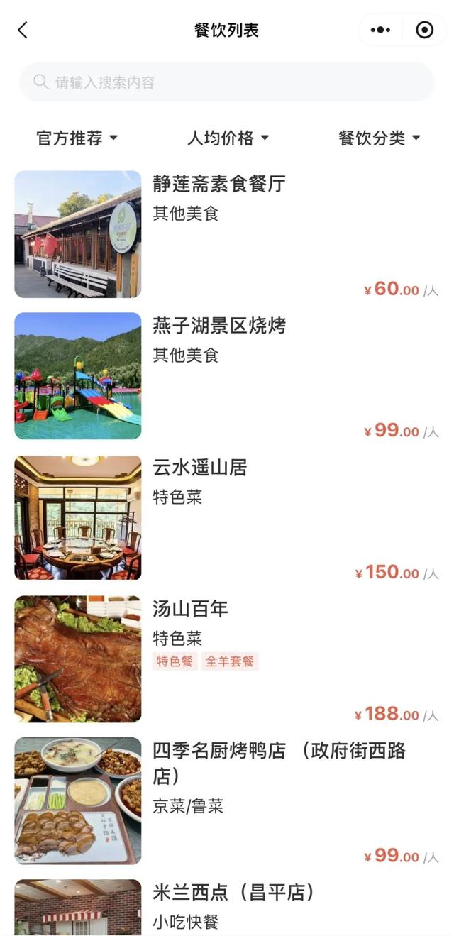 除了景区服务,小程序还整合了昌平全域旅游配套资源:从景区周边的庭院民宿到高品质度假酒店,从康陵春饼宴、阳坊涮肉等特色美食到凤冠冰箱贴、长城文创等网红纪念品,均可一键查询、预订。
