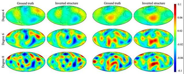 合成测试结果:在地球内部结构球谐表征下,利用新的人工智能全波形反演层析成像框架可以很好地恢复三维模型输入,较传统基于数值模拟的算法加速数万倍。北京大学供图。