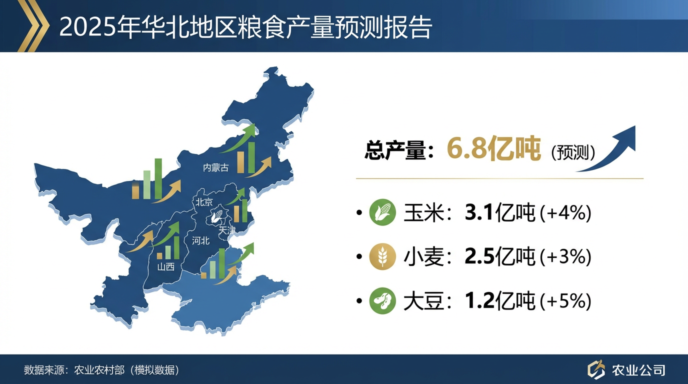 在“体现2025年华北地区粮食产量,PPT风格的汇报图片”的指令下,Nano Banana 2生成的图片中,分别标注出了华北地区各大省份的地理位置、粮食产量模拟数据等信息。用户只需修改数据,就能直接使用。