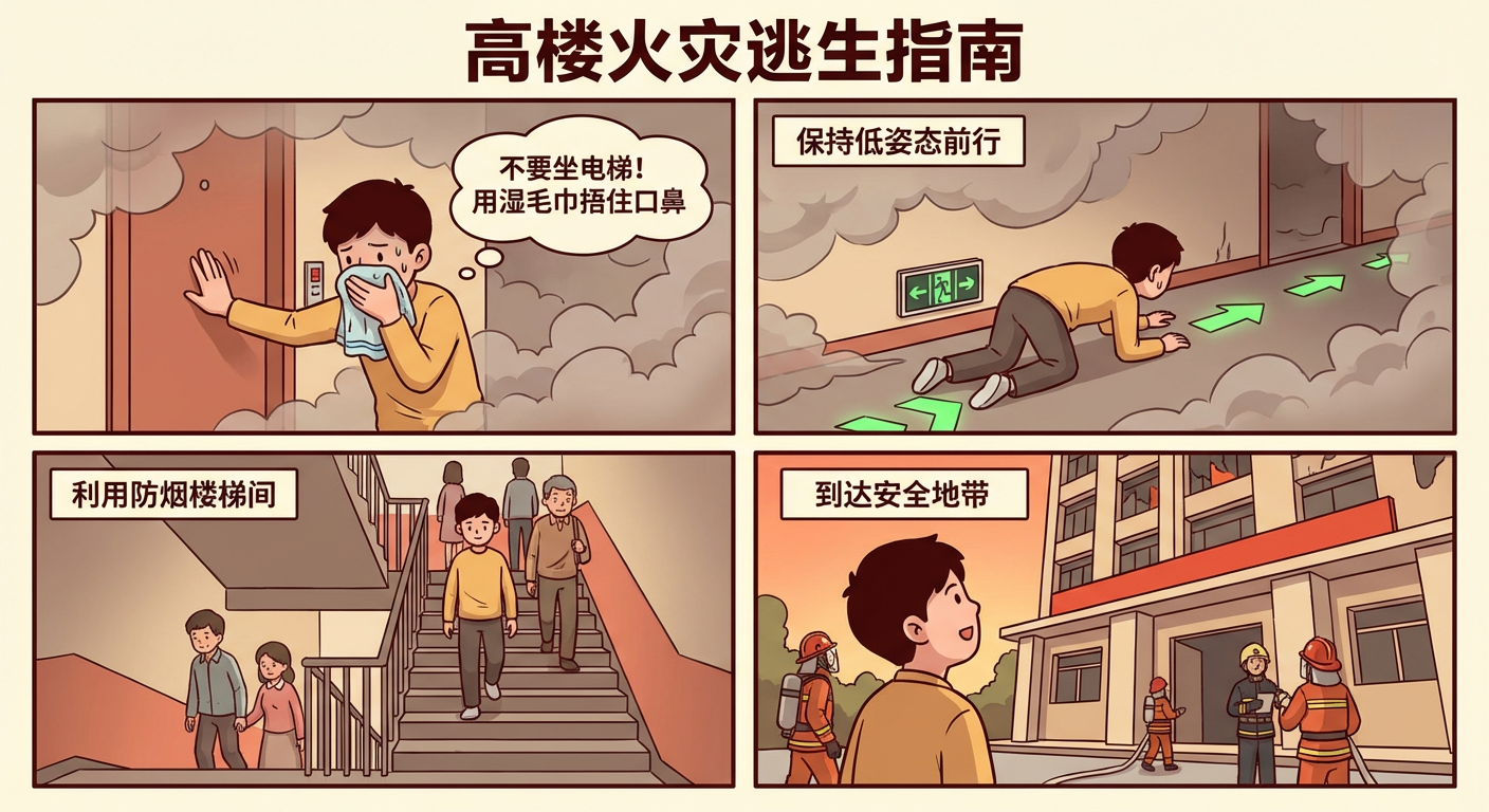 面对漫画生成等创作任务,Nano Banana 2同样表现出合格的审美。以“四格漫画,展现高楼火灾时的合理逃生方式”的提示词为例,生成图片几乎可以直接打印作为消防知识普及海报使用。
