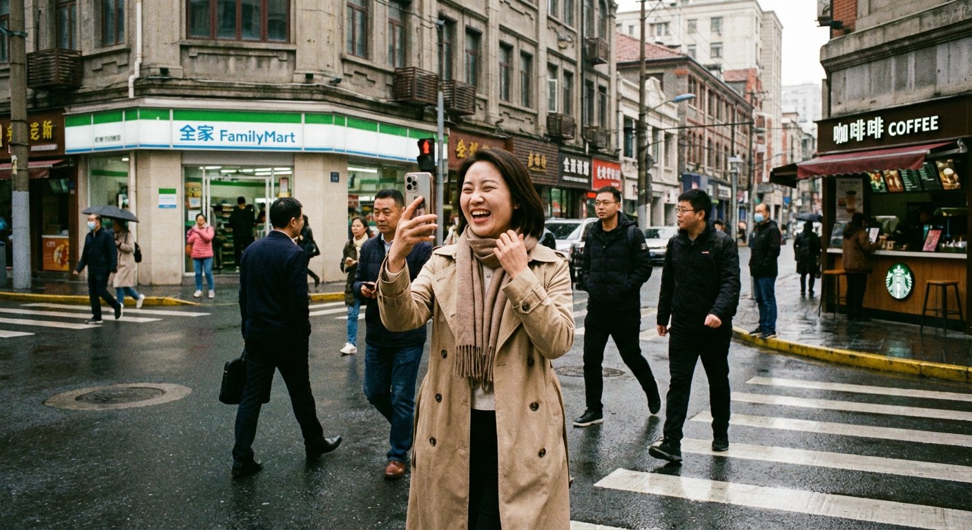 在“一张街角抓拍照,一位女士边走边手机打视频电话,路边有来往行人”的提示词下,Nano Banana 2生成的图片除了呈现来往行人、视频电话等核心要素,还自主增添了马路、斑马线、路边咖啡店等要素。