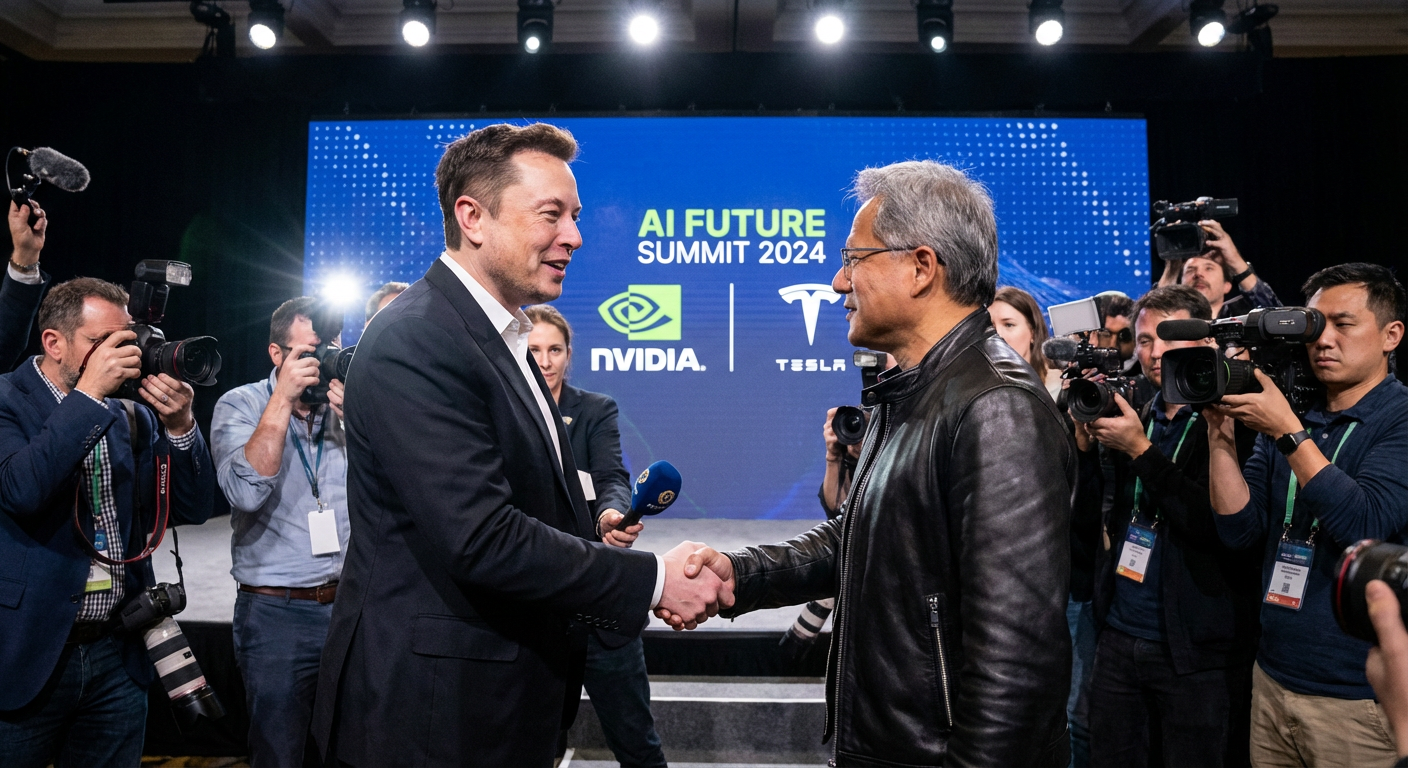 (提示词:马斯克与黄仁勋在发布会上握手的照片)