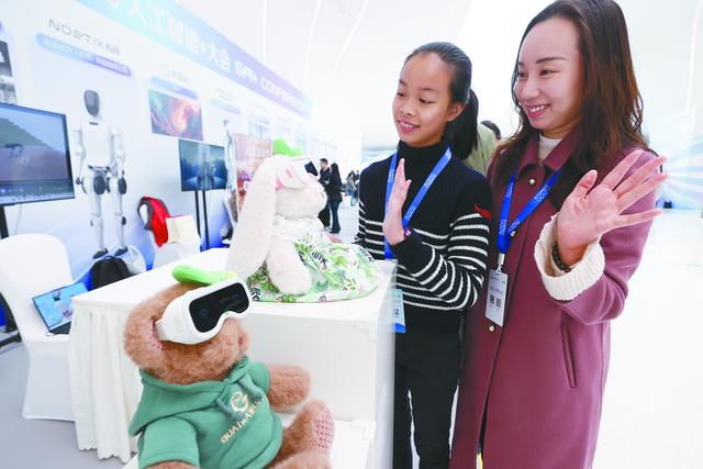 图片说明4:游客与2025全球人工智能+大会上的AI玩具互动。(视觉中国)