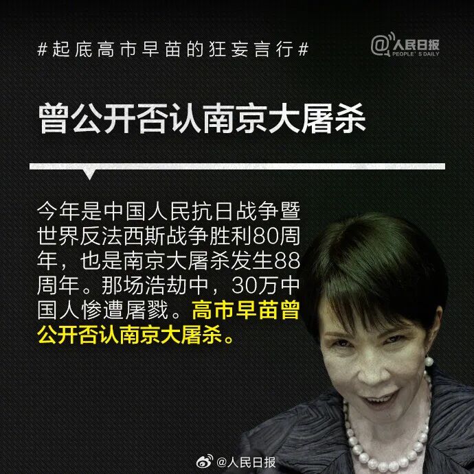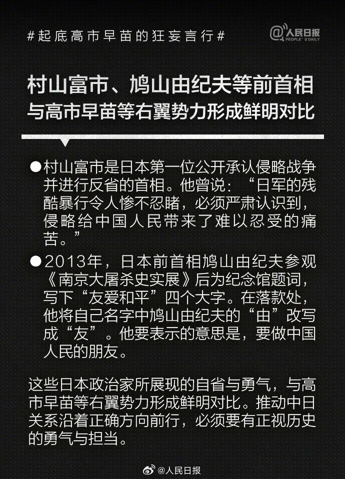 1993年高市早苗当选日本国会议员后,公开主张修改日本和平宪法、扩大和改名日本自卫队、参拜靖国神社,其言行与许多臭名昭著的日本右翼政客如出一辙。高市2014年来参拜靖国神社超10次。