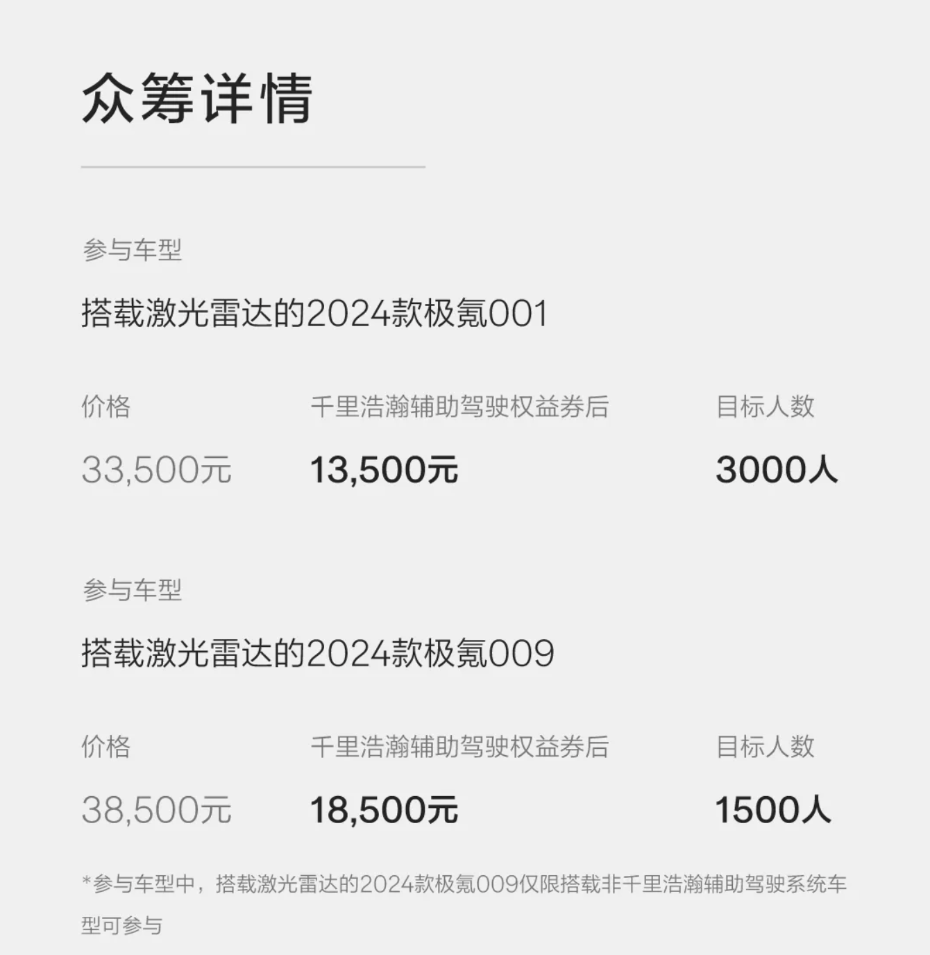 众筹信息显示,2024款极氪001众筹价格为13500元,参与人数达到3000人即可成功。2024款极氪009众筹价格为18500元,参与人数达到1500人即可成功。