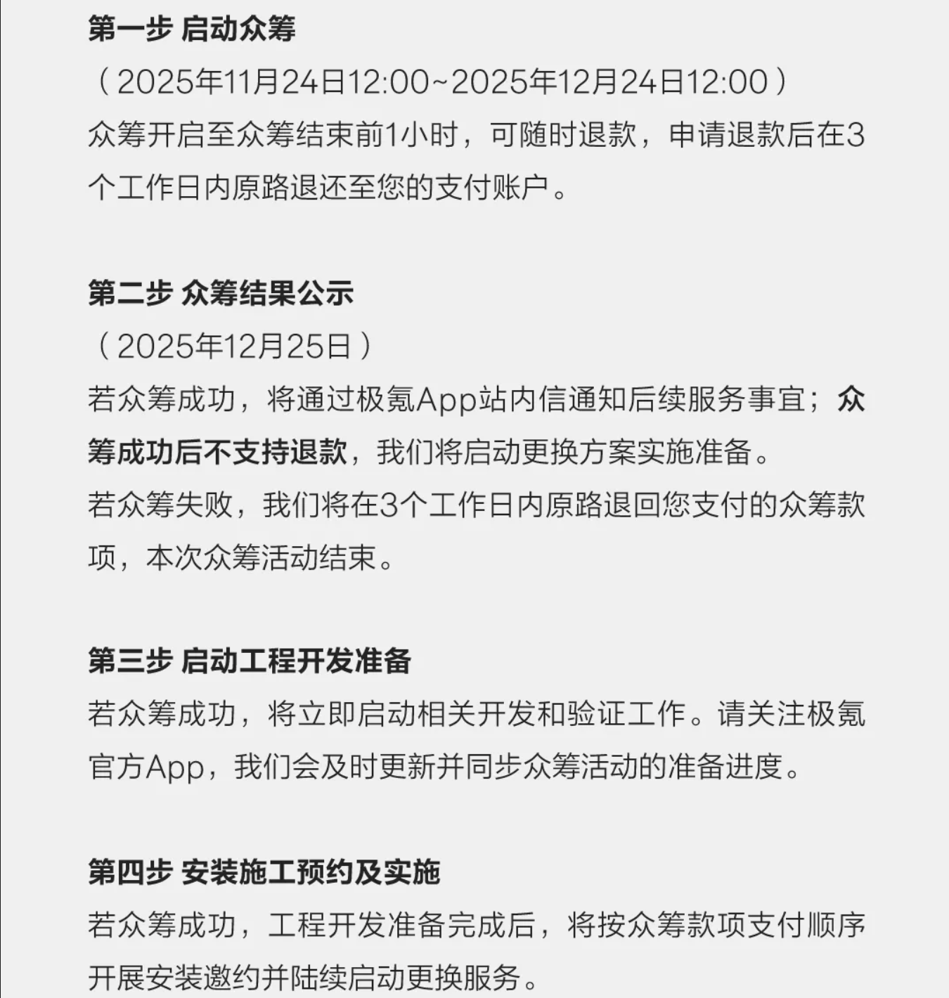 若众筹成功,将通过极氪App站内信通知后续服务事宜;众筹成功后不支持退款,极氪将启动更换方案实施准备;若众筹失败,极氪将在3个工作日内原路退回支付的众筹款项,本次众筹活动结束。众筹成功后极氪将立即启动相关开发和验证工作,并会在极氪App及时更新并同步众筹活动的准备进度。工程开发准备完成后,将按众筹款项支付顺序开展安装邀约并陆续启动更换服务。