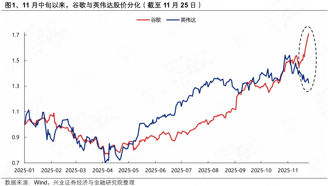 算力:谷歌 VS 英伟达,TPU VS GPU。11中旬以来,谷歌与英伟达股价开始分化,除了“AI泡沫”叙事扰动之外,近期Meta计划采购谷歌TPU的消息,也引发了市场对于谷歌TPU是否会替代英伟达GPU市场份额的讨论。