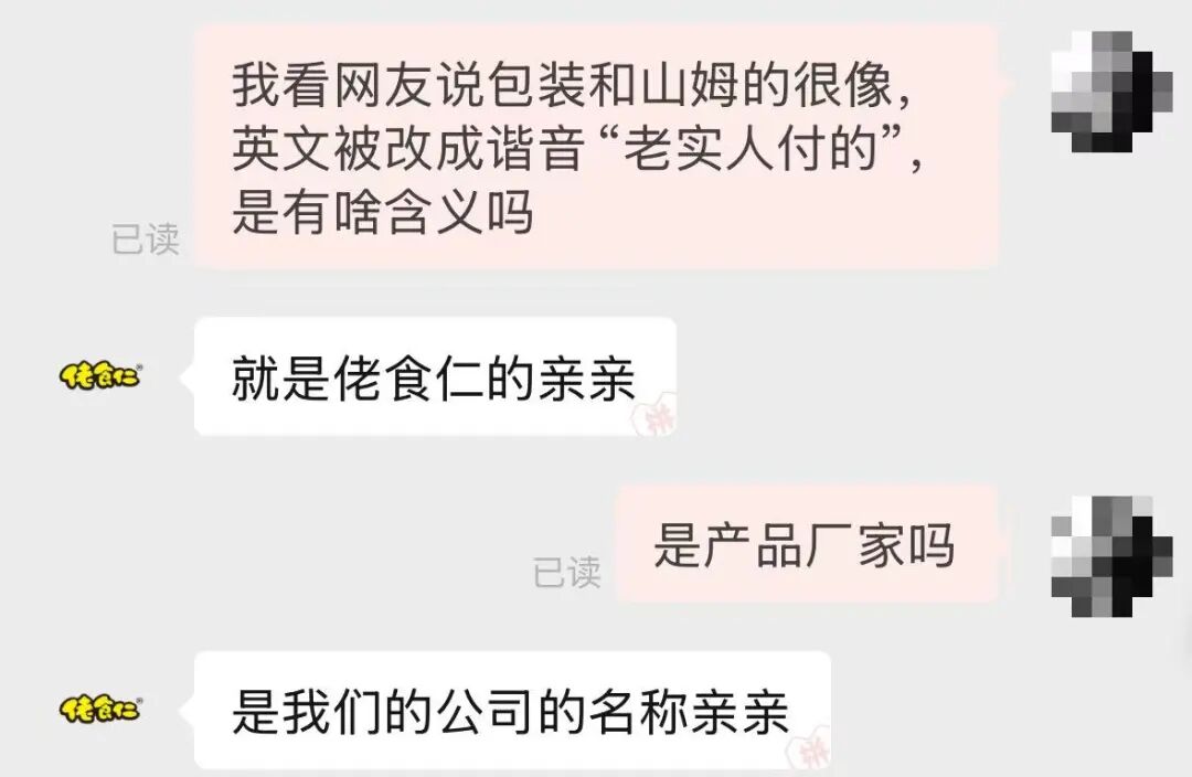 ▲网友发帖截图根据网友图片,二者都是黄色的包装,包装上文字的摆放位置极为相似,而在产品商标处,山姆产品中的“Member’s Mark”则变成了“Laoshiren’s Food”。发帖网友质疑该包装上的文字“阴阳”购买的人。