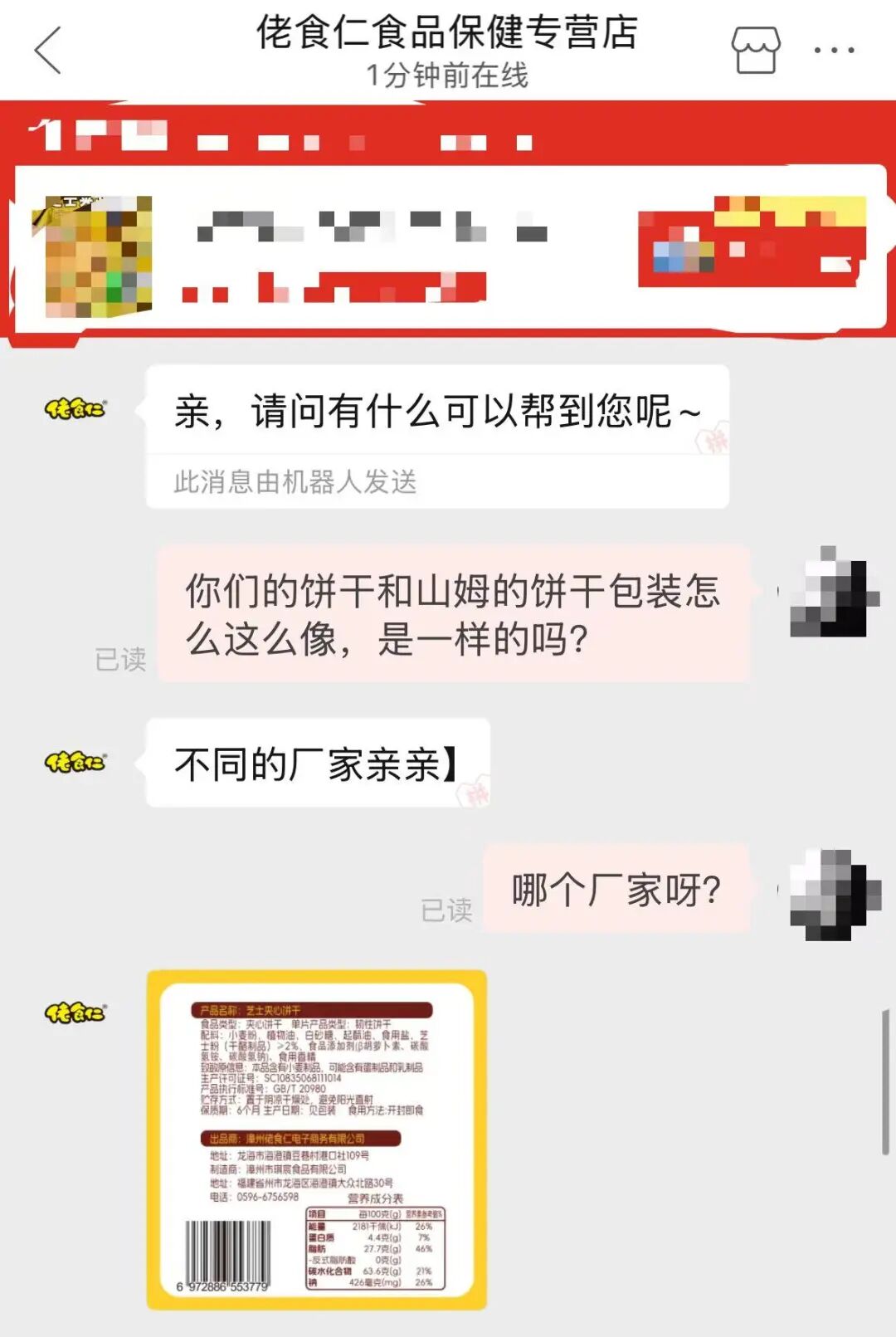11月26日,记者在电商平台搜索发现,售卖该产品的卖家名为“佬食仁食品保健专营店”。记者询问客服,为何其饼干与山姆的饼干包装如此相似,是否为同一款?客服表示,是不同的厂家。记者随后询问关于“Laoshiren’s Food”的问题,客服介绍,“佬食仁”是其公司名称。