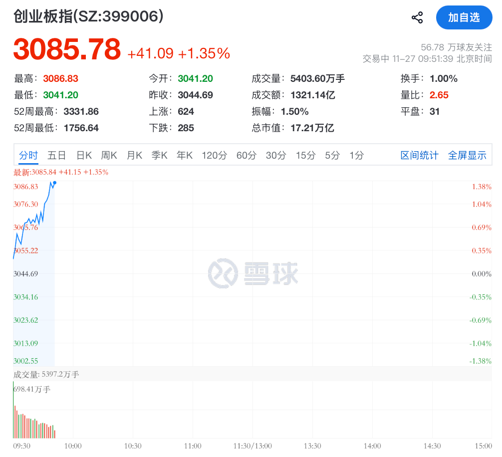 11月27日,A股三大股指开盘涨跌不一,沪指高开0.08%,深成指低开0.03%,创业板指低开0.11%。