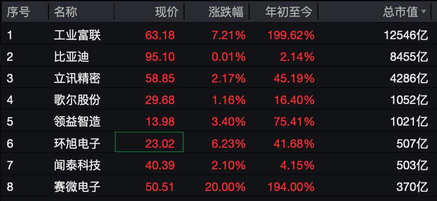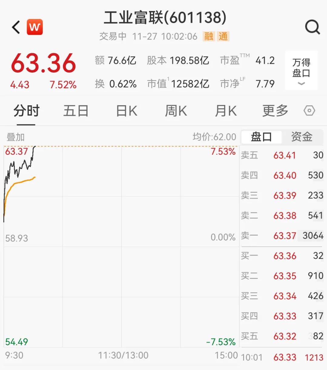 上午,消费电子代工指数大涨5%。工业富联涨超7%,报63.36元/股,最新市值达12582亿元。