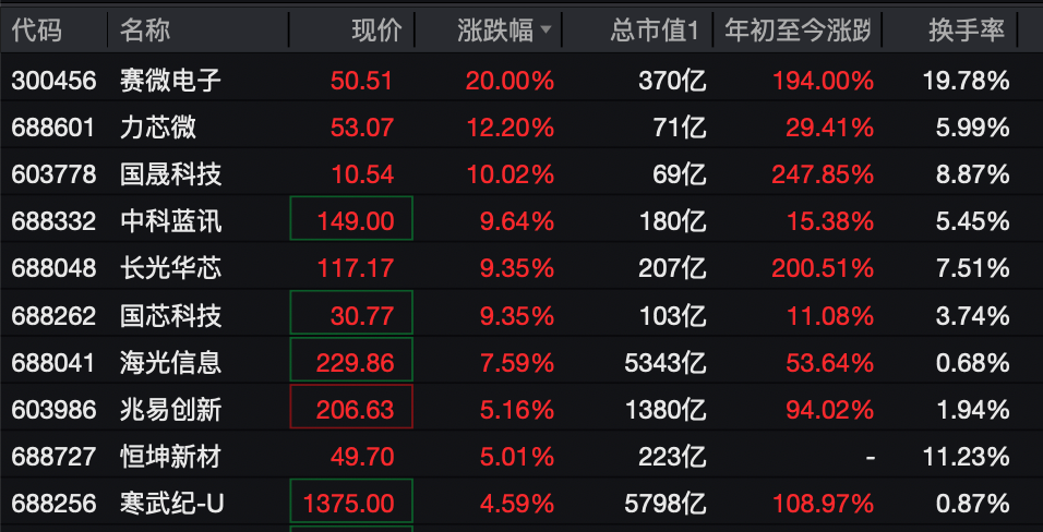 个股方面,赛微电子大涨20%,报50.51元/股,再创历史新高。国晟科技涨停,力芯微涨超12%。