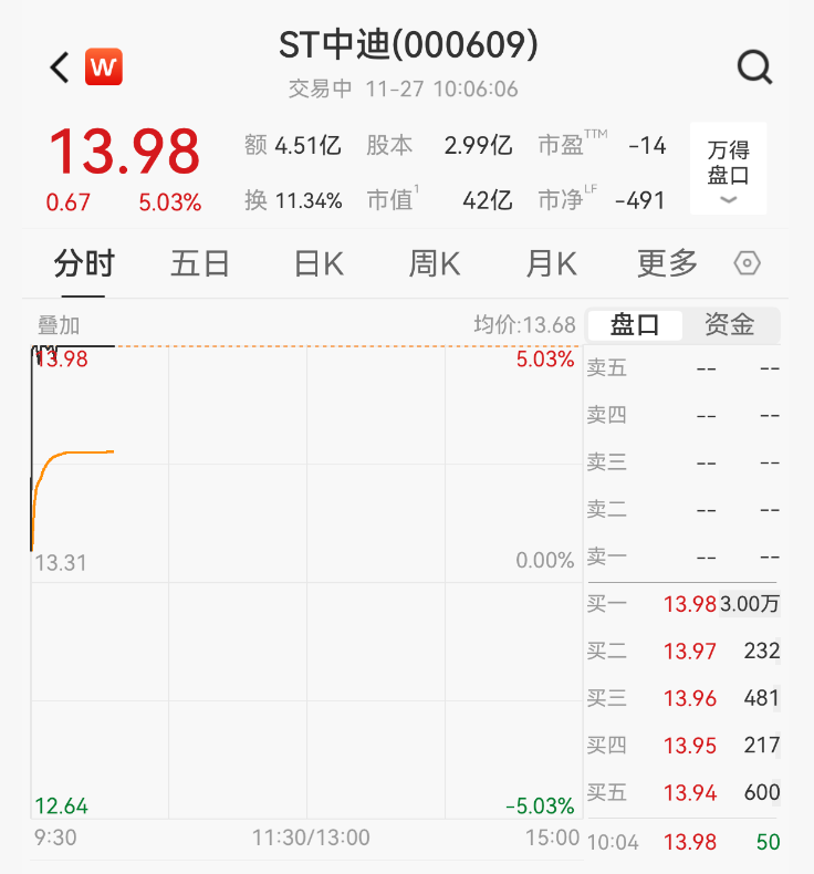 11月27日早盘,ST中迪开盘直线涨停,录得8天4板。