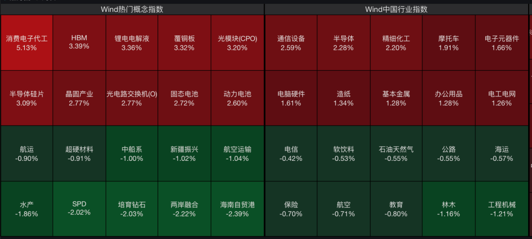 从板块看,通信设备、半导体板块领涨市场,消费电子代工、锂电电解液、光模块CPO、覆铜板等概念股表现活跃,而海南自贸港、两岸融合、培育钻石、水产、航空运输等板块出现回调。