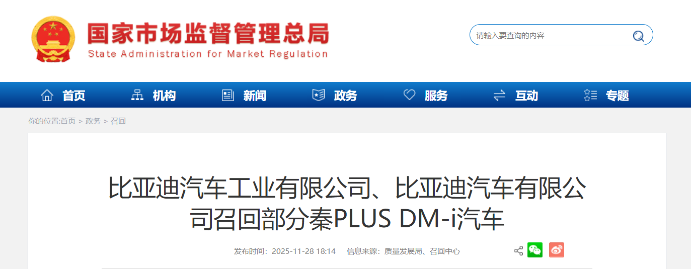 召回编号S2025M0190I:自即日起,召回2021年1月7日至2022年9月30日期间生产的部分秦PLUS DM-i车型,共计36091辆。