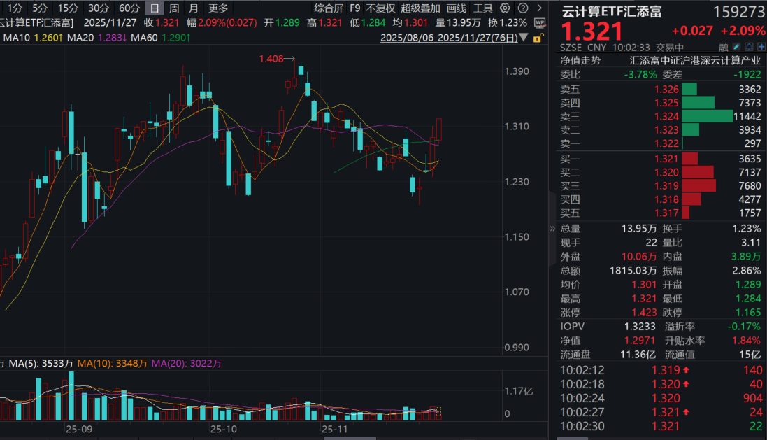 今日(12.1),算力板块再度大涨,港股阿里和A股“易中天”纷纷上冲,云计算ETF汇添富(159273)盘中大涨超2%,强势冲击两连阳,成交额超2500万元!