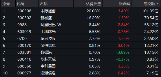云计算ETF汇添富(159273)标的指数成分股涨跌互现:中际旭创、汉得信息涨超3%,阿里巴巴-W涨超2%,新易盛、腾讯控股涨超1%。