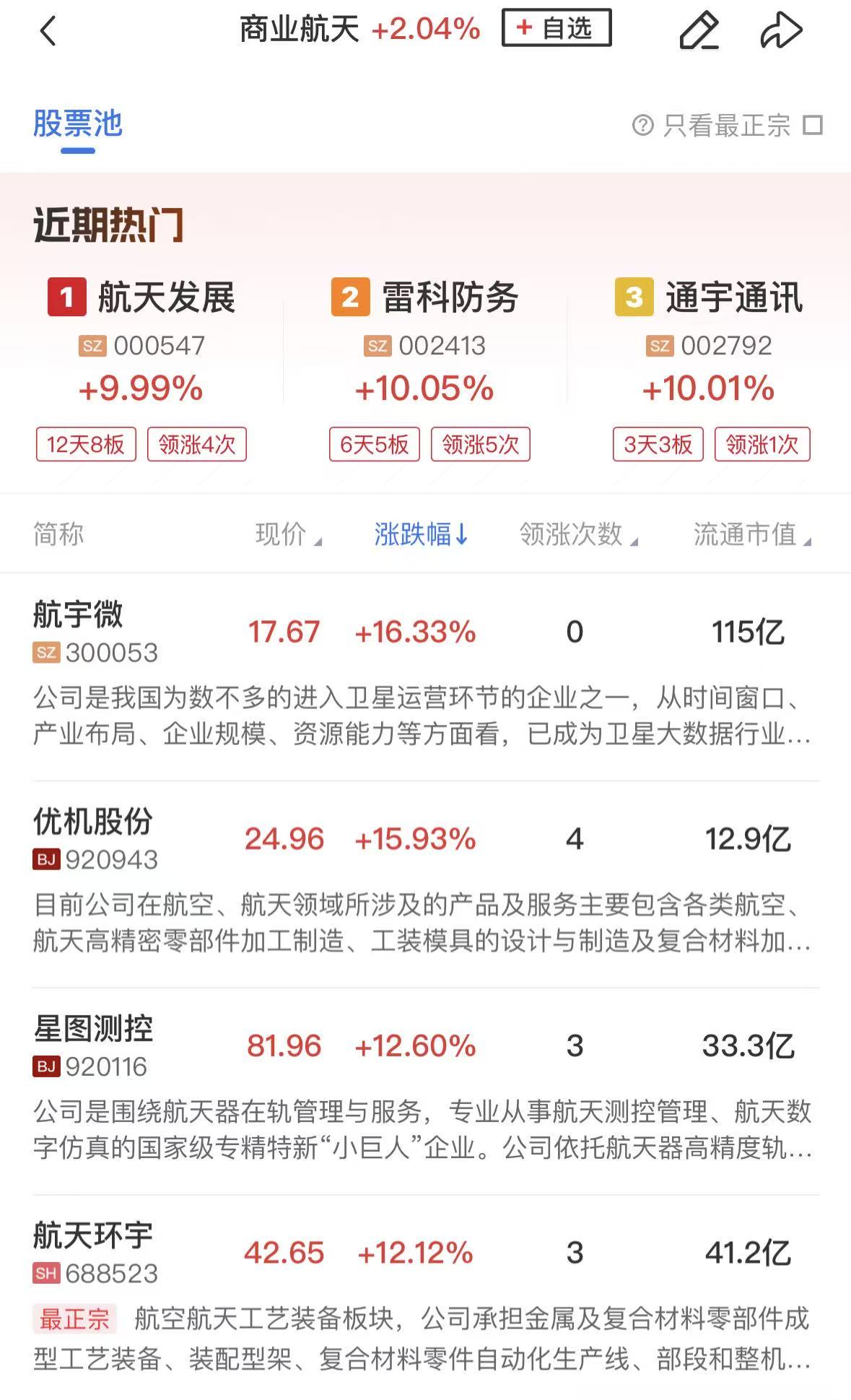 商业航天概念延续强势,航天发展12天8板,雷科防务6天5板,光启技术、通宇通讯、万通发展、顺灏股份等个股涨停。