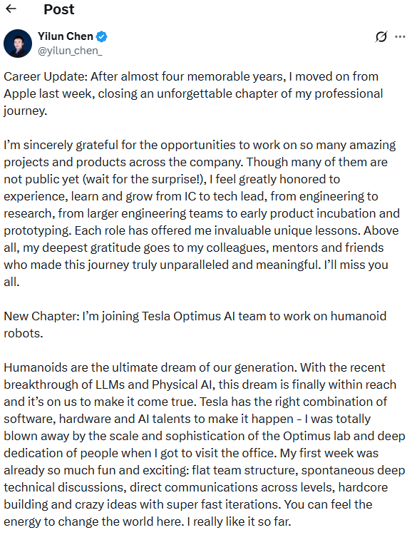 曾参与苹果多个重要项目的Yilun Chen在X上发帖指出,在苹果的工作让他快速成长,他感谢导师、同事和跨部门合作者对他职业发展轨迹的塑造,称这段经历令人难忘,并强调每个团队都教会了他关于技术扩展和产品愿景指导的经验,同时也让他适应了快速变化的研究环境。