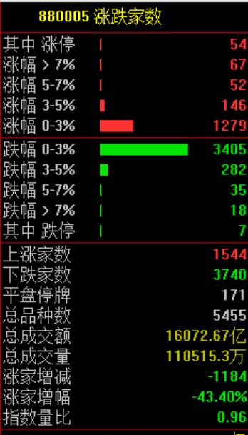 市场共1544只个股上涨,54只个股涨停,3740只个股下跌。