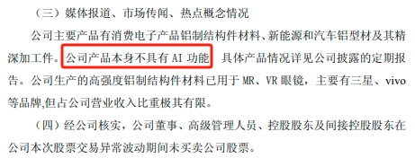 2连板福蓉科技也发布异动公告称,公司产品本身不具有AI功能,公司生产的高强度铝制结构件材料已用于MR、VR眼镜,主要有三星、vivo等品牌,但占公司营业收入比重极其有限。