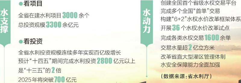 水资源是经济社会发展的基础性、先导性、控制性要素。以2024年为例,我省全社会用水总量255.21亿立方米,万元GDP用水量、万元工业增加值用水量相比“十三五”末分别下降16.8%、31.2%,水资源对经济社会发展的支持也更加明显、高效。