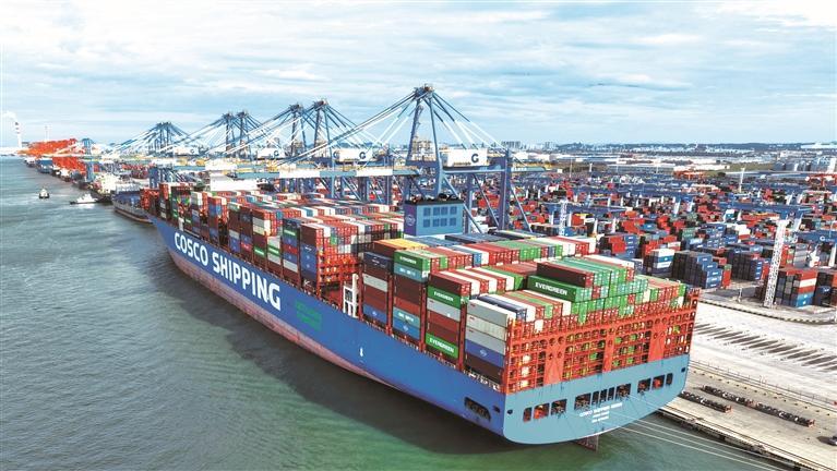 11月11日,一艘海轮在钦州港集装箱自动化码头卸货。 新华社发