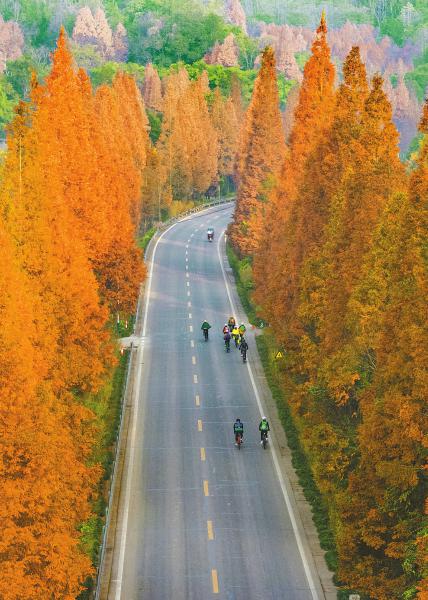12月1日,被称为“最美乡村路”的崇州重庆路怀远镇宝峰村段,两旁的水杉树如同一支支燃烧的火炬,在冬日暖阳下呈现出一片橙红的色调。单车爱好者们骑行在这如画的景观大道上,尽情享受美好时光。李旭 摄(C视觉)