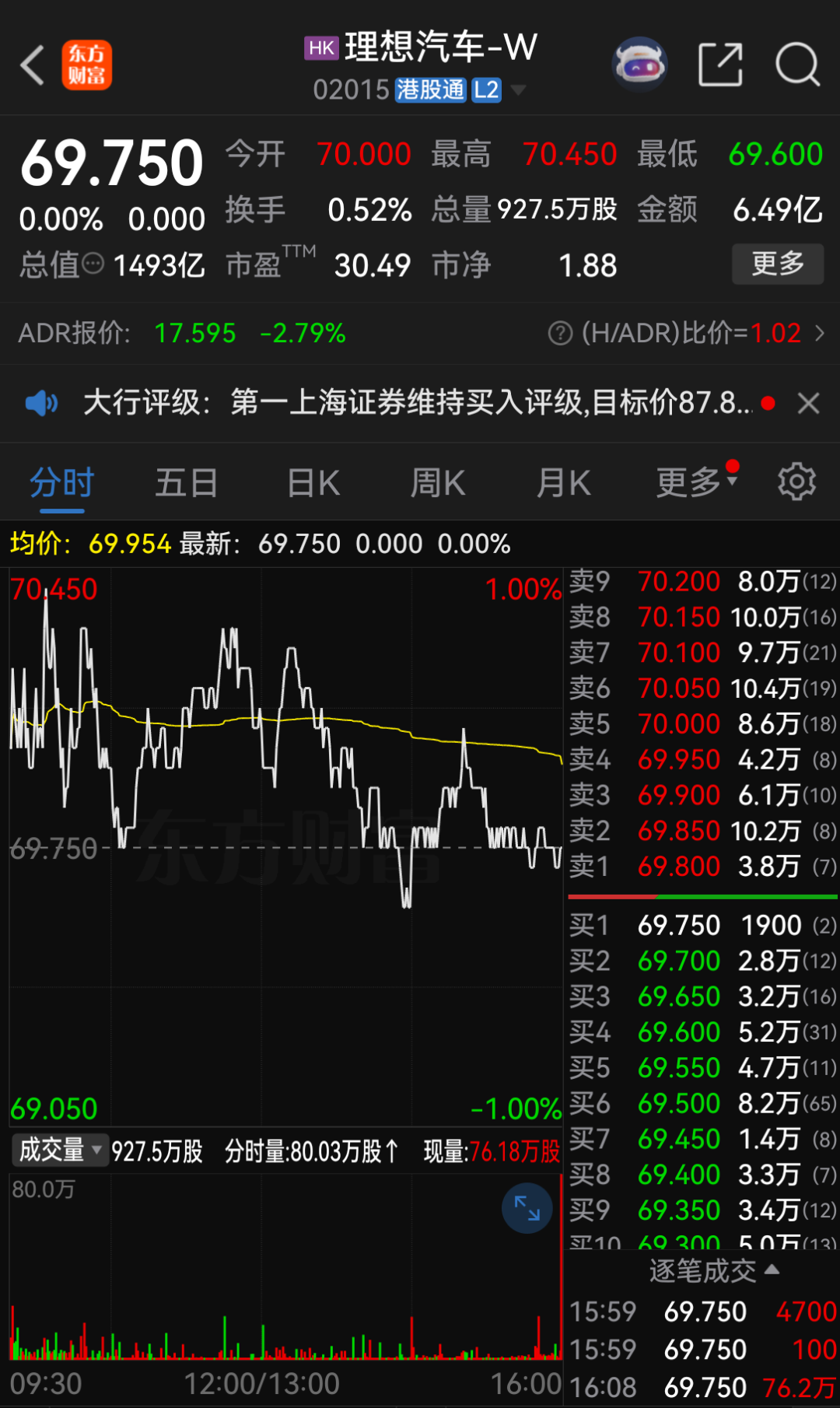 截至12月3日收盘,理想汽车港股股价报69.75港元/股,总市值为1493亿港元。