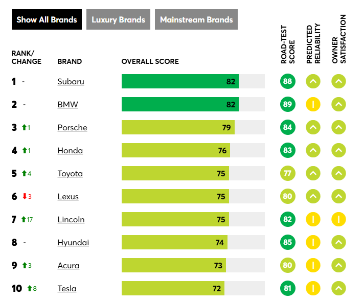 《消费者报告》一向以严厉闻名,是美国权威的评估机构之一。这份年度品牌评分榜基于道路测试,同时参考车主调查中得出的可靠性、安全性以及整体顾客满意度进行评定。
