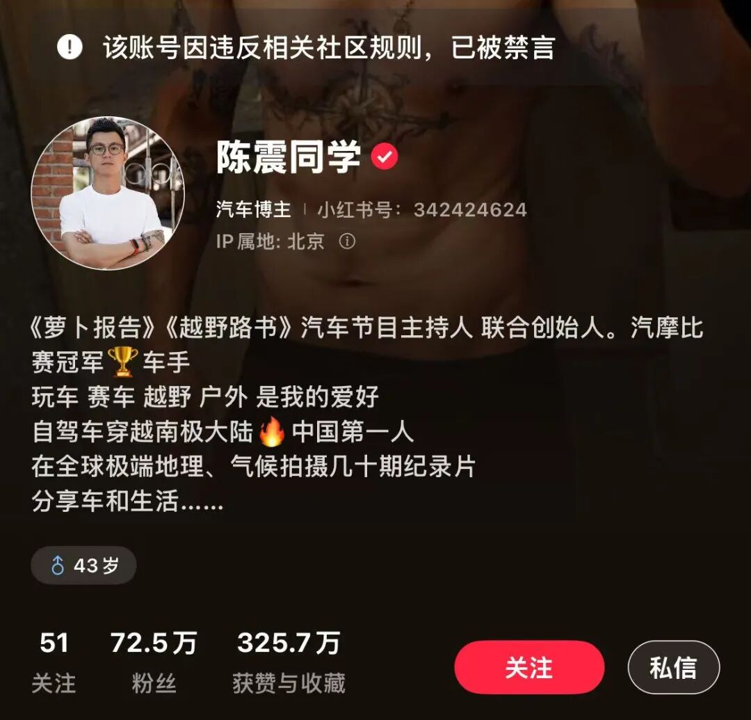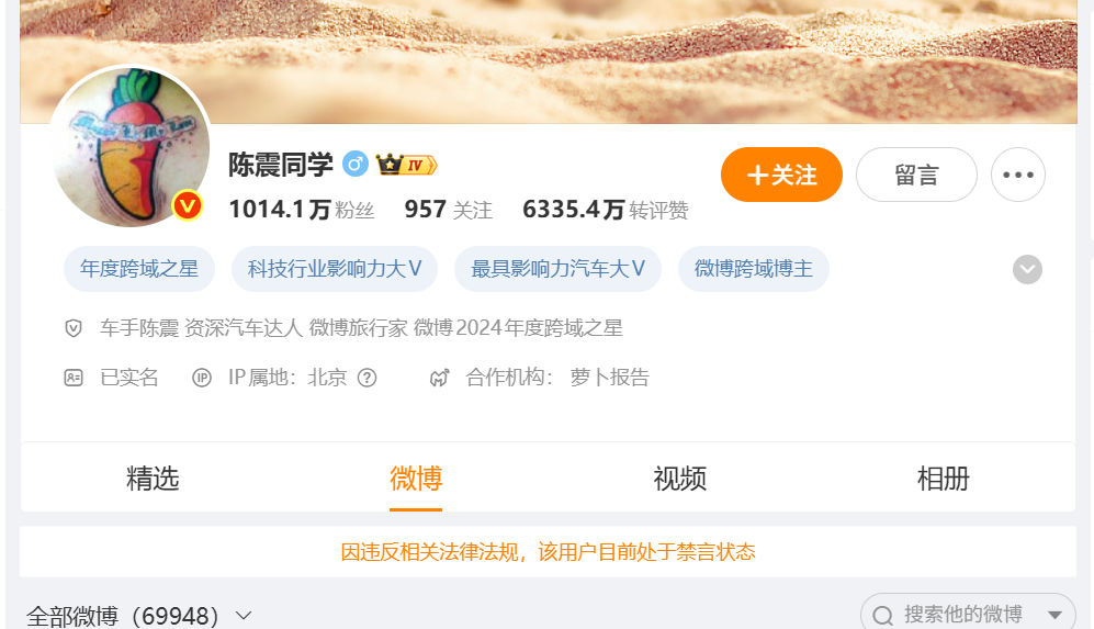 12月5日记者查询发现,知名车评人陈震在包括微博、抖音、B站、小红书等在内的多个平台被禁言。