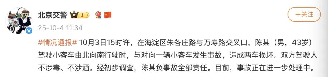 北京市交管部门于10月4日通报,事故双方均未涉酒涉毒,陈某负事故全部责任。