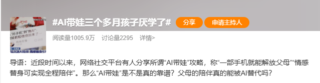 近日,话题“AI带娃三个多月孩子厌学了”引发热议。
