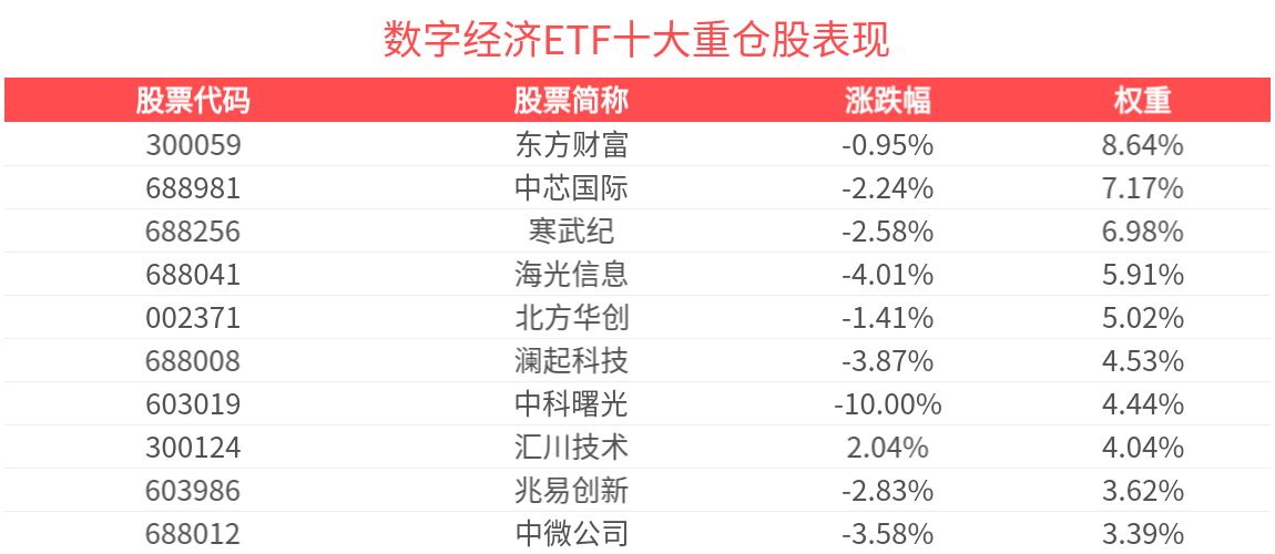 据Wind数据显示,截至2025年11月28日,中证数字经济主题指数前十大权重股分别为东方财富、寒武纪、中芯国际、海光信息、北方华创、中科曙光、澜起科技、兆易创新、汇川技术、中微公司,前十大权重股合计占比54.6%。(以上所列示股票为指数成份股,仅做示意不作为个股推荐。过往持仓情况不代表基金未来的投资方向,也不代表具体的投资建议,投资方向、基金具体持仓可能发生变化。市场有风险,投资需谨慎)